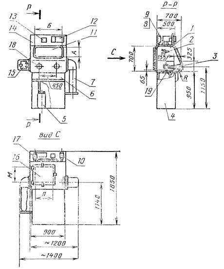 1 - корпус; 2 - душевик-распылитель; 3 - перчатки; 4 - подставка; 5 - сборник жидких отходов; 6 - вентильная панель; 7 - узел удаления твердых отходов; 8, 11 - окно по ГОСТ 23410; 9 - светильник; 10 - фильтр приточный; 12 - пульт управления; 13 - тягонапоромер; 14 - панель приборов; 15 - шлюз; 16 - монтажная дверь; 17 - фильтр вытяжной; 18 - обойма (d); 19 - 2 люка (К×Л).