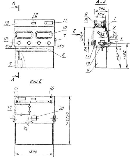 1 - корпус; 2 - душевик-распылитель; 3 - перчатки; 4 - подставка; 5 - сборник жидких отходов; 6 - вентильная панель; 7 - заглушка люка; 8, 10 - окно по ГОСТ 23410; 9 - светильник; 11 - пульт управления; 12 - тягонапоромер; 13 - панель приборов; 14 - монтажная дверь; 15 - фильтр вытяжной; 16 - фильтр приточный; 17 - дверка люка; 18 - обойма; 19 - 2 люка; 20 - люк для транспортера (К×Л)