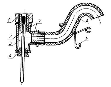 1 – точка слива воды из водонагревателя; 2 –термометр; 3 – т-образная труба; 4 – резиновая пробка; 5 –зажим; 6 – резиновый трубопровод; 7 – ниппель