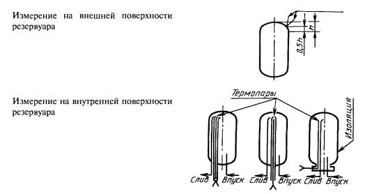 10.1. Температуру воды измеряют без отвода воды спомощью термопар. Термопары располагают внутри верхней части резервуара. Наметаллических резервуарах термопары могут быть установлены на внешнейповерхности резервуара (см. черт. 3).