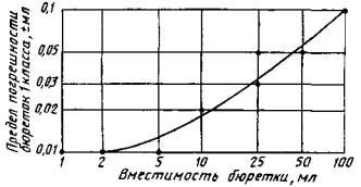 6.2.Соотношение пределов погрешности и вместимости для бюреток 1-го класса указаныв приложении1 (черт. 5).
