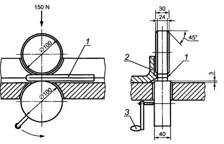 Давление, создаваемое каждымроликом на поверхность испытуемого образца, должно быть не более 3150 Н и неменее 2450 Н. Для устранения повреждения электродов применяют ограничивающеесопротивление.