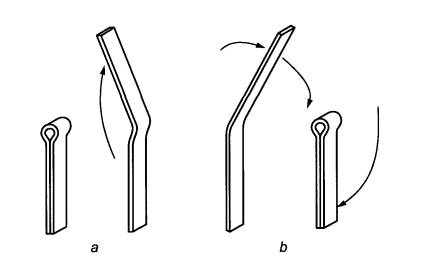 Перегибы делают следующимобразом: сначала испытуемый образец перегибают вручную, для этого рекомендуетсяприспособление, изображенное на рисунке А.5 (приложение А).Испытуемый образец вставляют по возможности глубоко в прорезь приспособления,перегибают на 90° в одну сторону, потом на 90° - в другую сторону, после чеговынимают.