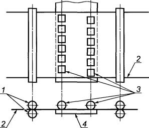 Ролики в каждом ряду устанавливаютна расстоянии 35 мм от центральной линии таким образом, чтобы середина ролиководного ряда была смещена относительно середины роликов противоположного ряда,как показано на рисунке А.4(приложение А).
