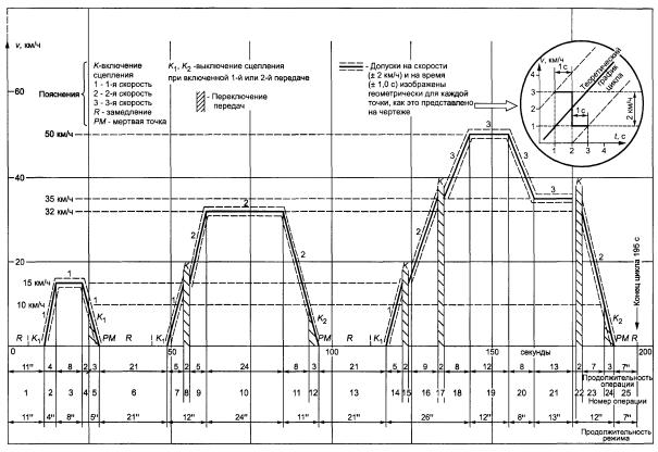 Р.3.2.3.1.1 Для транспортных средств, оснащенных двигателем с воспламенением от сжатия, используют вторую часть цикла, описанного в дополнении 1 к приложению Г. Три последовательных ездовых цикла должны быть проведены в соответствии с Р.3.2.3.4.3.