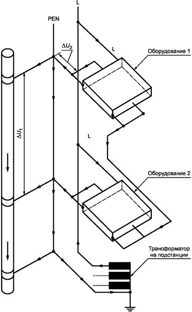 Пункт 548.4 специально адресован разработчикам электрических установок, предназначенных для офисов или помещений промышленного назначения. На рисунке 2a ток в нейтральном проводнике (PEN-проводнике), вызванный несимметричной нагрузкой в трехфазных сетях, делится между PEN-проводником, сторонними проводящими частями, экранами и оболочками кабелей, а также проводниками, предназначенными для обмена информацией, и тем самым вызывает появление помех. При прохождении тока в PEN-проводнике происходит падение напряжения ΔU = ΔU1 + ΔU2. В TN-S-системе ток нейтрального проводника протекает только по нулевому рабочему проводнику (N-проводнику), не вызывая падения напряжения в РЕ-проводнике.
