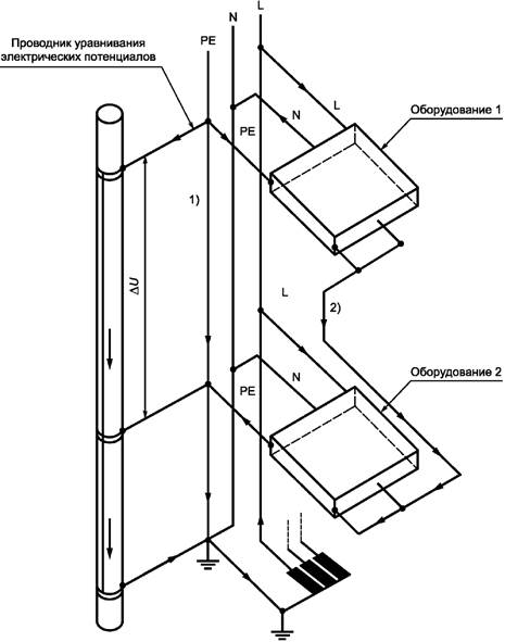 1) Эквипотенциальное соединение (уравнивание и выравнивание электрических потенциалов) может включать проводники, оплетки кабелей и металлоконструкции зданий, такие как водопроводы, трубопроводы отопления и горячего водоснабжения, металлические короба кабелепроводов и потенциаловыравнивающие сетки, установленные на этажах здания.
