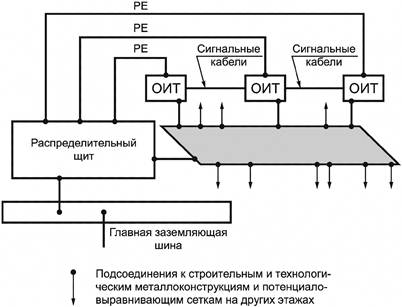 Действие РЕ-проводников может быть многократно усилено за счет использования горизонтального и вертикального (между этажами) эквипотенциального заземления путем применения многоярусной системы уравнивания электрических потенциалов. Эта система имеет многочисленные соединения со строительными и технологическими металлоконструкциями, открытыми проводящими частями электроустановки и металлоконструкциями других назначений (см. рисунок В.3). В этой системе широко используются проложенные по стенам помещения заземляющие шины, выполненные в виде замкнутых контуров, удлиняющих собой главную заземляющую шину, служащую для подсоединения к ней заземляющих проводников от оборудования информационных технологий (см. 548.7).