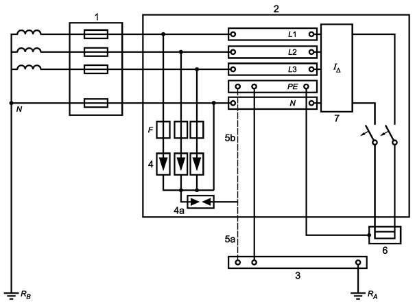 4 - УЗИП; 5а, 5b - заземление УЗИП; 6 - защищаемое оборудование; 7