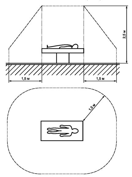 710.3.9 окружающая обстановка пациента: Любое пространство, где может произойти намеренный или непреднамеренный контакт пациента с частями медицинской электрической системы или с каким-либо лицом, имеющим контакт с частями системы (см. рисунок 710А).