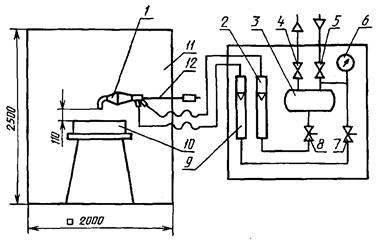 Емкость для сбора пены смачивают раствором пенообразователя. Сняв крышку, заливают в сосуд 1 дм3 раствора пенообразователя. Закрывают крышку, открывают клапан 13 и измеряют уровень раствора в мерной трубке, закрывают клапаны 5, 13 и кран 6. Открывают воздушный баллон и с помощью редукционного клапана устанавливают требуемое давление в сосуде 11, контролируемое манометром. Обычно испытания проводят при давлении 0,6 МПа.