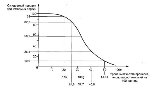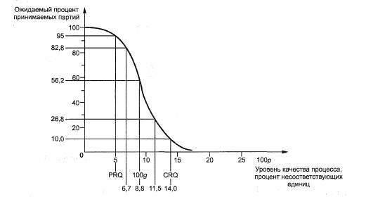 Когда выборочный план определен в соответствии с 2.4.1 настоящего стандарта, вероятность приемки, соответствующая PRQ, приблизительно равна Ра = 1 -α, а вероятность приемки, соответствующая CRQ, приблизительно равна Ра =β (для планов по приложению А α = 0,10 и β = 0,10).