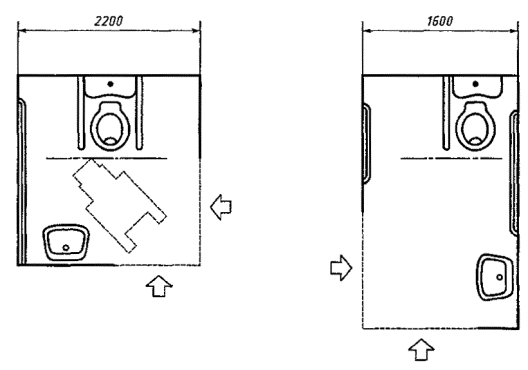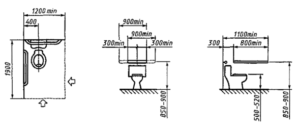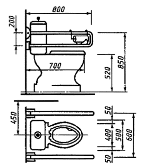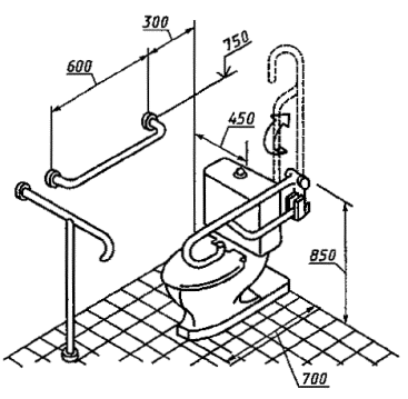 5.4.3 Поручни в туалетной комнате или туалетной кабине не должны препятствовать фронтальному или боковому подступу инвалида, перемещающегося в кресле-коляске, к унитазу.