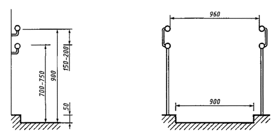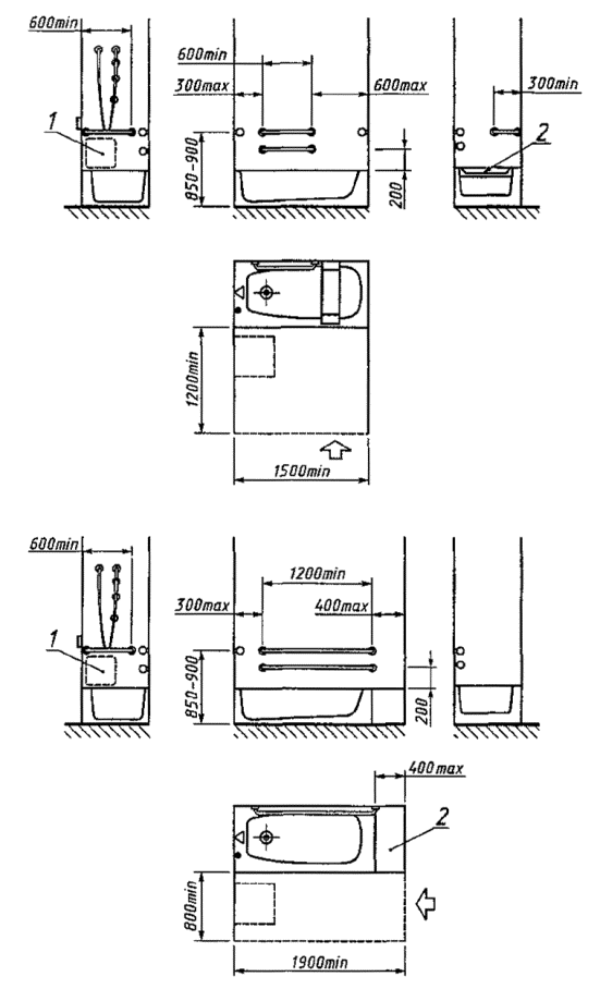 При этом горизонтальный участок поручней ванны (для парных поручней - участок верхнего поручня) должен располагаться на высоте от 850 до 900 мм от уровня пола ванны, а горизонтальный участок нижнего парного поручня - на высоте не более 200 мм от верхней кромки ванны.