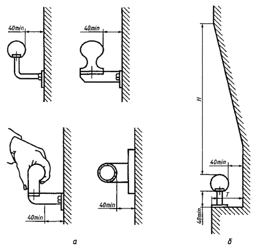5.1.7 Расстояние между опорным устройством и ближайшим элементом оборудования или стенками помещения должно быть не менее 40 мм (рисунок 1а). Допускается уменьшение этого расстояния до 35 мм для поручней и ручек, устанавливаемых на створках дверей и сиденьях транспортных средств.