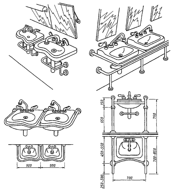 5.4.10 В туалетных, ванных комнатах и других местах общего пользования, где установлены раковины умывальников, следует предусматривать поручни для опоры инвалидов при пользовании умывальниками (рисунок Г.9).