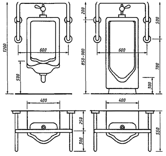 5.4.7 Для обеспечения удобства при пользовании настенным писсуаром в общественных туалетах, доступных для инвалидов, должны быть предусмотрены поручни комбинированного типа (рисунок Г.6).