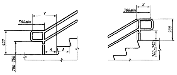 5.3.3 Лестничные поручни должны иметь с обеих сторон участки, выходящие за пределы длины лестничного марша вверху, как минимум, на 300 мм и внизу, как минимум, на 300 мм с прибавлением глубины одной ступени лестницы А, как показано на рисунке В.2. Указанные участки должны быть горизонтальными.