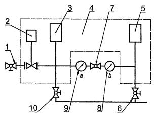 1, 6, 7, 10 - краны; 2 - испытуемый образец; 3, 5 - воздушный резервуар объемом 1 дм3; 4 - отсек постоянной температуры; 8, 9 - манометры