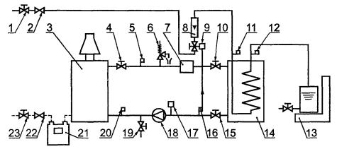 1, 4, 10, 15, 19,23 - запорно-регулирующие клапаны; 3 - испытуемый котел; 2, 22 - регуляторы расхода газа; 5, 11, 12, 16, 20 - термометры; 6- предохранительный клапан; 7 - тепловой компенсатор; 8 - ротаметр; 9 - регулирующий клапан; 13 - весы; 14 - теплообменник; 17 - расширительный бак; 18 - циркуляционный насос; 19 - дренаж; 21 - газовый счетчик