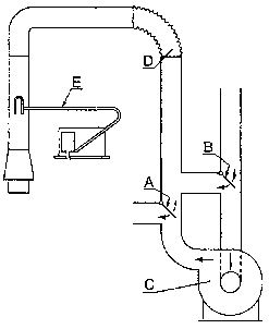 А и В - перегородки для получения восходящей и обратной тяги; С - вентилятор; D- гибкий участок; Е - трубка Пито для измерения скорости потока