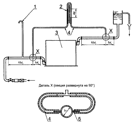 1 - труба для сброса воздуха, 2 - дифференциальный манометр, 3 - котел, 4 - гибкая труба; 5 - отверстие диаметром 3 мм без внутренней резьбы