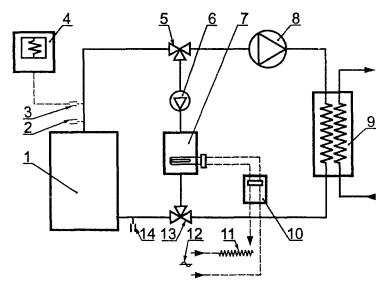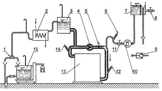 1 - трехходовой кран; 2 - охладитель; 3 - компенсационный бак; 4 - циркуляционный насос; 5 - клапан управления I; 6, 12, 14 - термометры; 7 - бак постоянного уровня; 8 - клапан управления III; 9 - подсоединение к распределительной трубе постоянного давления; 10 - водомер; 11 - клапан управления II; 13 - испытуемый котел; 15 - сосуд для взвешивания