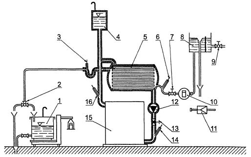 1 - сосуд для взвешивания; 2 - трехходовой кран; 3, 6, 14, 16 - термометры; 4 - расширительный сосуд (вне системы циркуляции); 5 - теплообменник; 7 - клапан управления II; 8 - бак постоянного уровня; 9 - клапан управления III; 10 - водомер; 11 - подсоединение к распределительной трубе постоянного давления; 12 - циркуляционный насос; 13 - клапан управления I; 15 - испытуемый котел