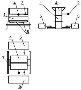 1 - основной корпус габаритными размерами (29,5 ± 0,5)´(28,0 ± 0,5)´(16,5 ± 0,5) см; 2 - рукоятка; 3 - задвижка; 4 - бункер; 5 - поддон; 6 - лопасти размером (1,25 ± 0,05) см