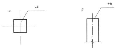 4.6.3 Действительные отклонения от проектных отметок показываются числовым значением в см для грунтовых и других поверхностей рельефа и в мм - для других элементов со знаком "плюс" в случае превышения или "минус" в случае занижения. Направляющую линию соединяют с точкой поверхности, к которой относится отклонение (рисунок 2).