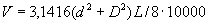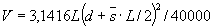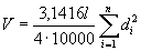 -вычисление объема бревна V,м3, как суммы объемов цилиндров по формуле