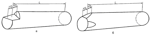 Длинубревна с подпилом или со скосом пропила измеряют от середины поверхностиподпила или скоса пропила на соответствующем торце бревна (рисунок 3аи 3б). Скос пропила допускается в пределах припуска по длине.