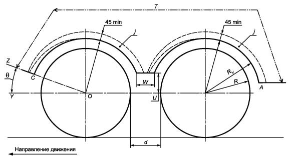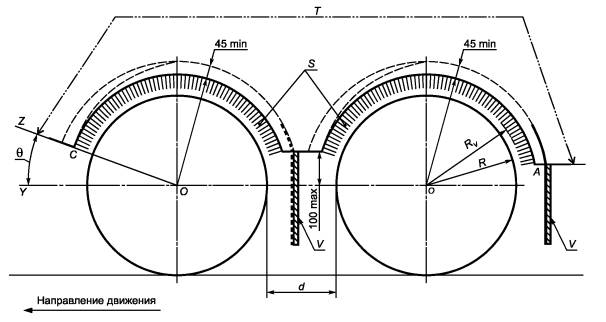 d £ 300 мм - расстояние между шинами, установленными на соседние оси; j - наружная боковина; θ - угол между горизонталью О - Y и плоскостью, проходящей через ось колеса О - Z; U - высота краев боковины; W - расстояние между нижними крайними точками краев боковины; Т - протяженность грязезащитного кожуха; R - радиус шины, установленной на ТС; Rv - расстояние по радиусу от оси колеса до наиболее удаленной точки внутренней кромки наружной боковины
