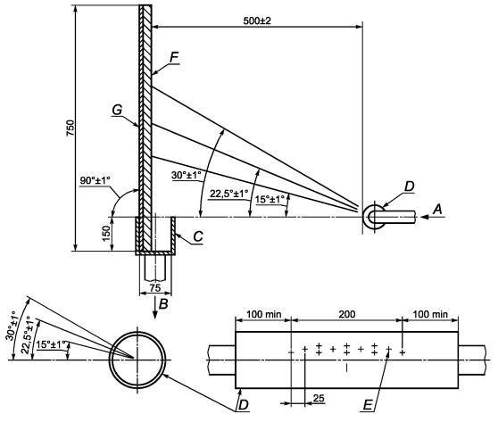 А - подача воды от насоса; в - слив; С - коллектор для воды с внутренними размерами: длина 500+5 мм, ширина 75+2 мм; D - труба из нержавеющей стали наружным диаметром 54 мм и толщиной стенки (1,2 ± 0,12) мм, шероховатость внутренней и наружной поверхностей трубы от Ra 0,4 до Rа 0,8; Е - двенадцать цилиндрических отверстий диаметром 1,68+0,01 мм, просверленных радиально без заусенцев и фасок; F - образец шириной 500+5 мм, подлежащий испытанию; G - жесткая пластина
