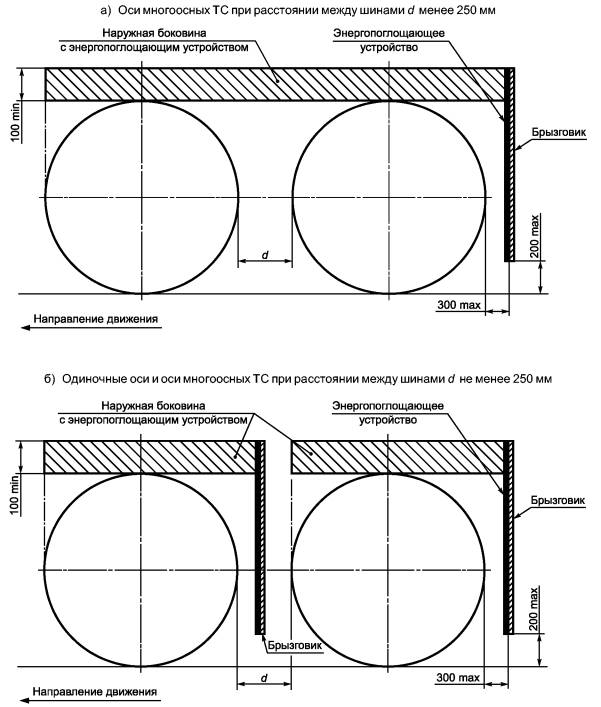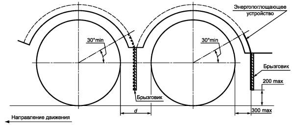 4.4.1.2 Для одиночных осей и осей многоосных ТС, у которых расстояние d между шинами превышает 300 мм, грязезащитный кожух должен соответствовать требованиям перечисления а) 4.2.1.1.