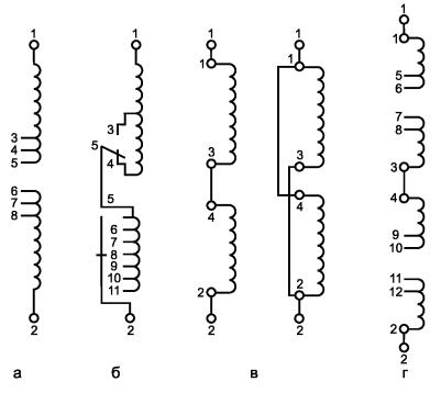 а - обмотка фазы с ответвлениями посредине; б - обмотка фазы с грубой и тонкой ступенями регулирования на одном конце обмотки; в - обмотка фазы, состоящая из двух частей, соединяемых последовательно или параллельно; г - обмотка фазы, состоящая из двух частей, соединенных последовательно, каждая из которых посредине ответвления
