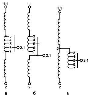 а - обмотка с ответвлениями, помещенная между последовательной и общей обмотками; б - обмотка с ответвлениями, помещенная в конце последовательной обмотки; в - обмотка с ответвлениями, один конец которой подключен к соединению между последовательной и общей обмотками