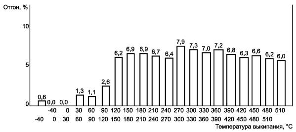 Диаграмму распределения фракций по температурам кипения используют для установления композитности топлива, и она должна иметь не менее двух максимальных и одного минимального значений процентного содержания фракций при определенных положительных значениях температур. Разности между максимальными и минимальным значениями отгона фракции должны быть не менее 20 % относительных, а наличие двух максимумов является обязательным.