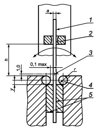 5.2.5 Верхняя кромка губок должна быть ниже осей валиков на расстоянии у, равном 1,5 мм для валиков радиусом 2,5 мм и менее 3 мм - для валиков большего размера.