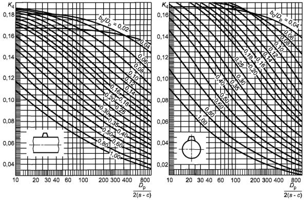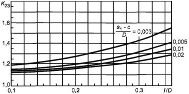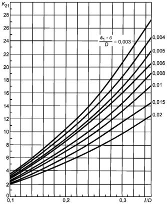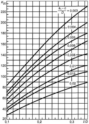 9.4.4. Коэффициенты K20 и K21 определяют по графикам, приведенным на рисунках 13 и 14 соответственно, в зависимости от относительной толщины днища (s1 - с)/D и относительной длины линии контакта опоры с днищем l/D.
