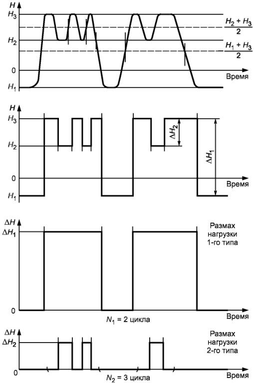 В соответствии с режимом эксплуатации размахи колебаний нагрузок могут быть разными. Условно их разделяют на главные (тип 1) и второстепенные (тип 2) (см. рисунок 1).