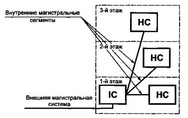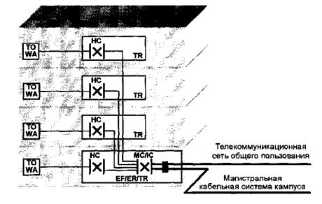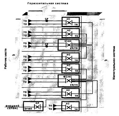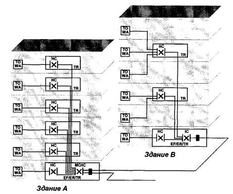 Магистральнаякабельная подсистема здания может также соединять между собой горизонтальныекроссы. Такие соединения рассматриваются только в качестве возможных дополненийк основной топологии системы типа "звезда".
