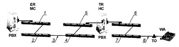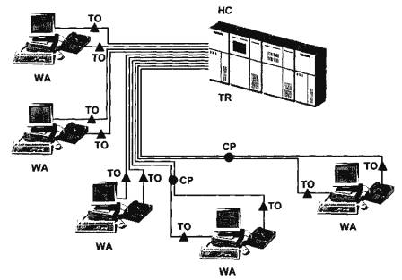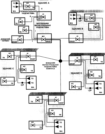 MC - главный кросс; IC -промежуточный кросс; HC - горизонтальный кросс; TO - телекоммуникационнаярозетка; TR - телекоммуникационная; ER - аппаратная; EF - городской ввод; WA -рабочее место; CP - консолидационная точка; DP - демаркационная точка; |×| - кросс; I - магистральная подсистема первогоуровня; II - магистральная подсистема второго уровня