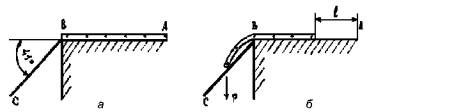 Образец укладывается на горизонтальной и плоской поверхности в соответствии со схемой на рисунке 2а таким образом, чтобы один конец образца находился в точке А, а другой - в точке В. Груз массой (0,023 ± 0,001) кг крепится к концу образца в точке В ниткой. Образец перемещают в направлении прямой АВ со скоростью не более 10 мм/с до тех пор, пока свисающий конец образца не коснется прямой линии ВС (рисунок 2б), составляющей с прямой АВ угол (41 ± 1)°.