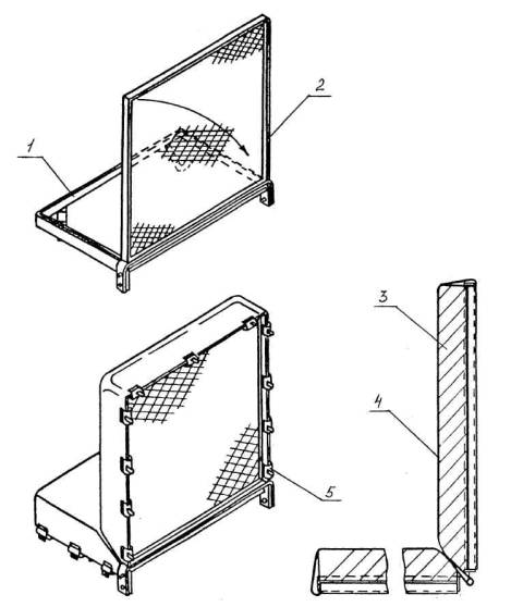 1, 2 - стальные рамы; 3 - обивочный материал; 4 - набивочный материал; 5 - зажим