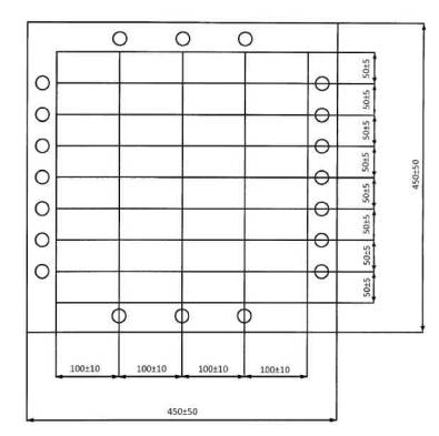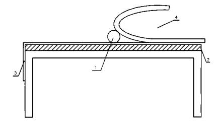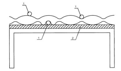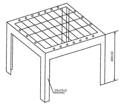 Испытательный стенд представляет собой станину, изготовленную из металлических уголков размером 25×25×3 мм. Размеры станины: высота (400 ± 50) мм, длина и ширина (400 ± 50) мм. На станине размещена проволочная сетка. На сетку уложена минераловолокнистая плита (подложка) размерами (450 ± 50)×(450 ± 50) мм. Толщина плиты должна составлять от 20 до 30 мм, а ее плотность - от 80 до 200 кг·м-3.