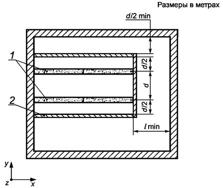 Схему типа J применяют для определения звукопоглощения на единицу площади, занимаемой штучными (дискретными) звукопоглотителями или экранами, имеющими прямоугольную форму. Дискретные звукопоглотители и экраны устанавливают так, чтобы один край находился на поверхности камеры или касался этой поверхности. Допускается использовать другие схемы с зазором у основания. Между кромкой экрана и поверхностью камеры не должно быть воздушного зазора. Площадь поверхности пола должна быть 10 - 15 м2. Экраны располагают в два или три параллельных ряда. Между отдельными экранами данного ряда не должно быть воздушного зазора. Наименьшее расстояние от любого экрана до поверхности камеры, кроме поверхности, которой касаются экраны, должно быть не менее 1 м, если эти поверхности не являются частью барьера. Ряды экранов или дискретных звукопоглотителей должны быть окружены звукоотражающим барьером. Одну или две стены реверберационной камеры можно также использовать как часть барьера (см. рисунки В.1 и В.2). Часть барьеров, параллельных экранам или звукопоглотителям, должна отстоять на расстоянии d/2 от центральной линии ближайшего ряда экранов или звукопоглотителей, где d - расстояние между параллельными рядами. Часть барьера, перпендикулярная к рядам экранов или звукопоглотителей, должна находиться на одном уровне с краями экранов или звукопоглотителей. Высота барьера может быть: