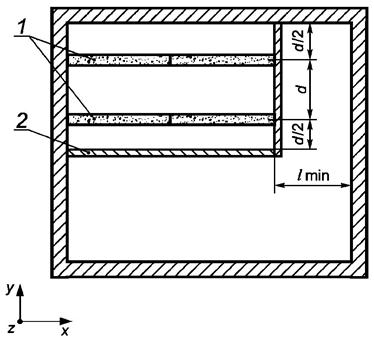 1 - экраны; 2 - барьер; d - расстояние между параллельными рядами экранов