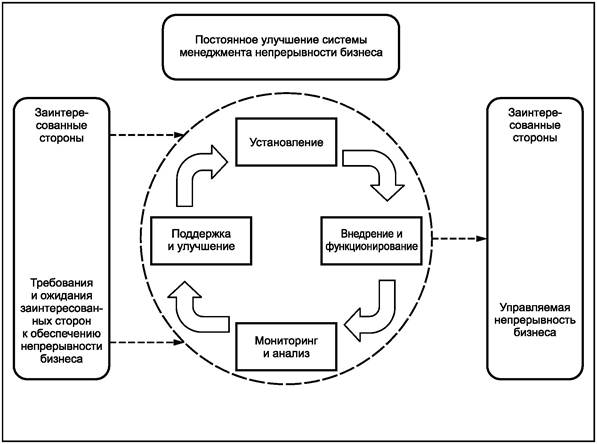 Широко распространенный подход, объединяющий цикл PDCA и виды деятельности по обеспечению непрерывности бизнеса, рекомендованные в [1], приведен на рисунке 2. Данный итеративный процесс обеспечивает создание и постоянное управление непрерывностью бизнеса организации (описание элементов жизненного цикла менеджмента непрерывности бизнеса см. в 3.7 [1]).