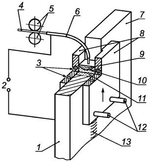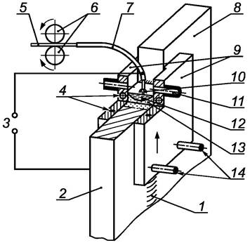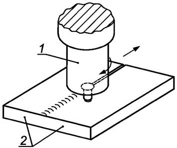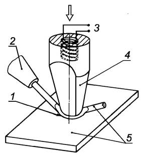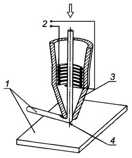 Примечание - Нагрев может быть постоянным или импульсным. Сварку выполняют с приложением силы без добавления присадочного материала. Силу прикладывают с помощью инструмента в виде клина или мундштука, через который подается одна из заготовок.